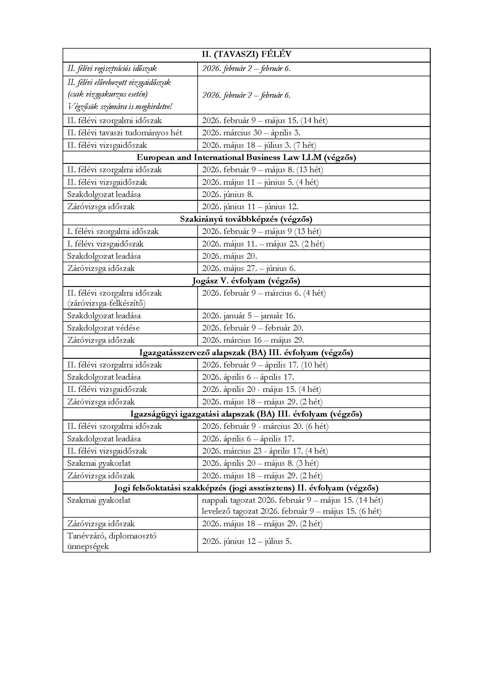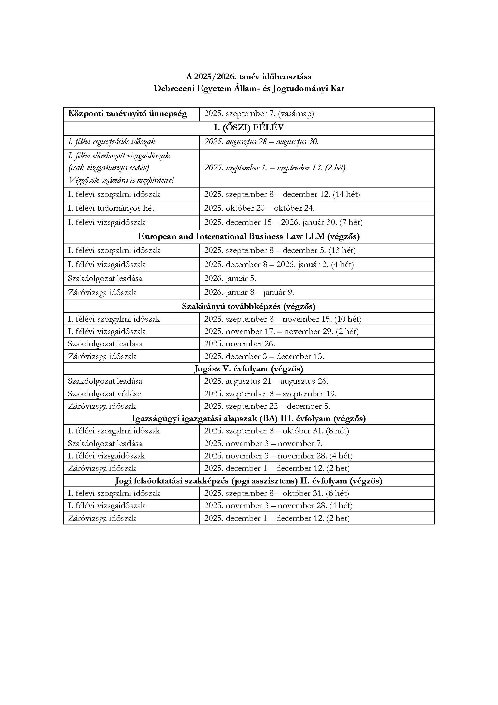 A tanév időbeosztása az Állam- és Jogtudományi Karon | Állam- és Jogtudományi Kar